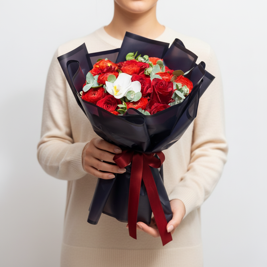Katmanlı yaprakları ile bilinen ranunculus çiçekleri, kırmızı tonların tutku dolu enerjisiyle birleşerek etkileyici bir görünüm sunar. İnce ve zarif bir sentez arayanlar için idealdir.